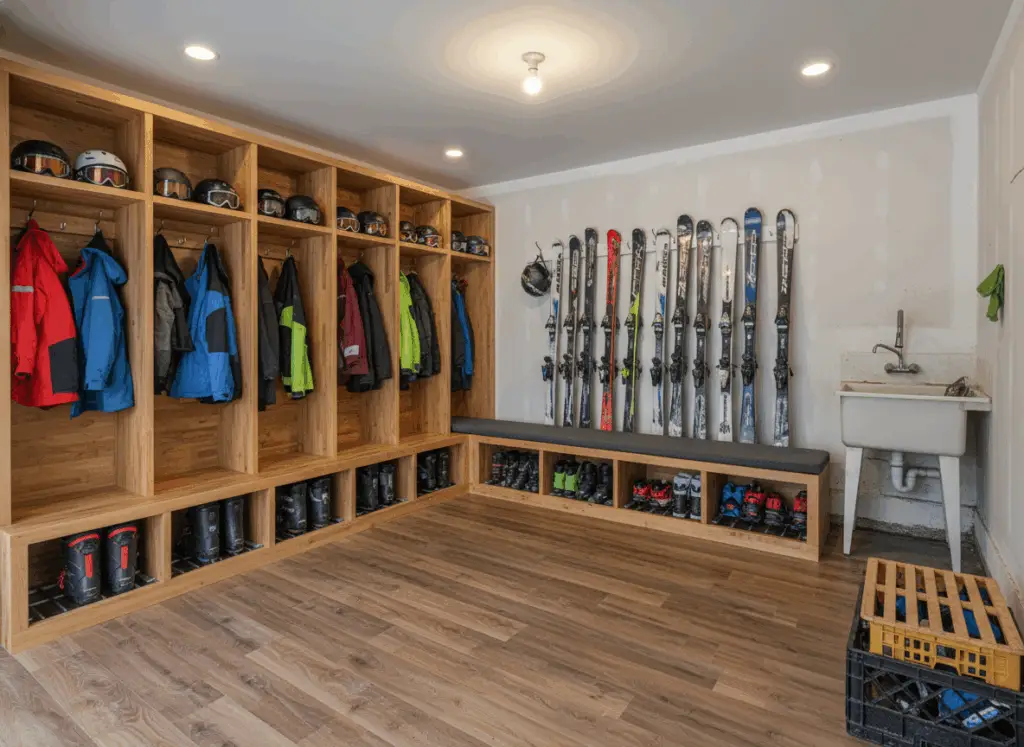Ski rental property needed organized mudroom to handle guests with ski gear, wet clothes, and boots. Transformed garage entry into custom ski mudroom. Built floor-to-ceiling cubbies, installed heated boot drying racks with ventilation, created ski/snowboard wall mount system, added custom bench seating with lift-up storage underneath, installed coat hooks at multiple heights (kids + adults), built shelf system for helmets and goggles, added waterproof luxury vinyl plank flooring with floor heating, installed utility sink for washing gear, created drip-dry area with drainage.