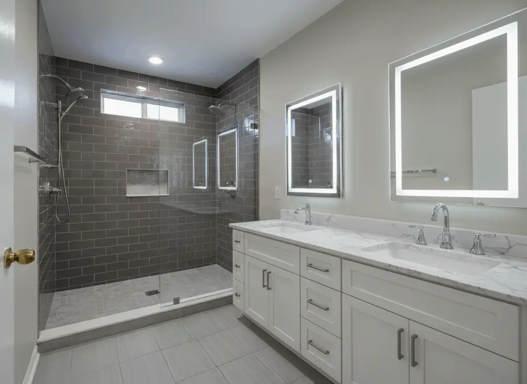 This West Ward family's master bathroom hadn't been updated since they moved in 16 years ago and featured dated oak cabinets, cultured marble counters, and a standard tub/shower combo. We created a modern spa-like retreat: removed tub and installed large walk-in shower with frameless glass and subway tile surround, installed floating double vanity with quartz countertop, added large-format porcelain tile flooring (heated floors), upgraded to rainfall showerhead plus handheld fixture, installed modern brushed nickel fixtures throughout, improved lighting with LED mirrors and pot lights, and added built-in shower niche for storage.