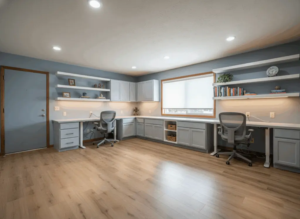 WFH transformed our unused dining room into a beautiful dual workspace in just 6 days. The custom built-ins give us tons of storage, the lighting is perfect for video calls, and the soundproof door means we're not constantly interrupting each other. It's made working from our Orillia home so much more productive and enjoyable.